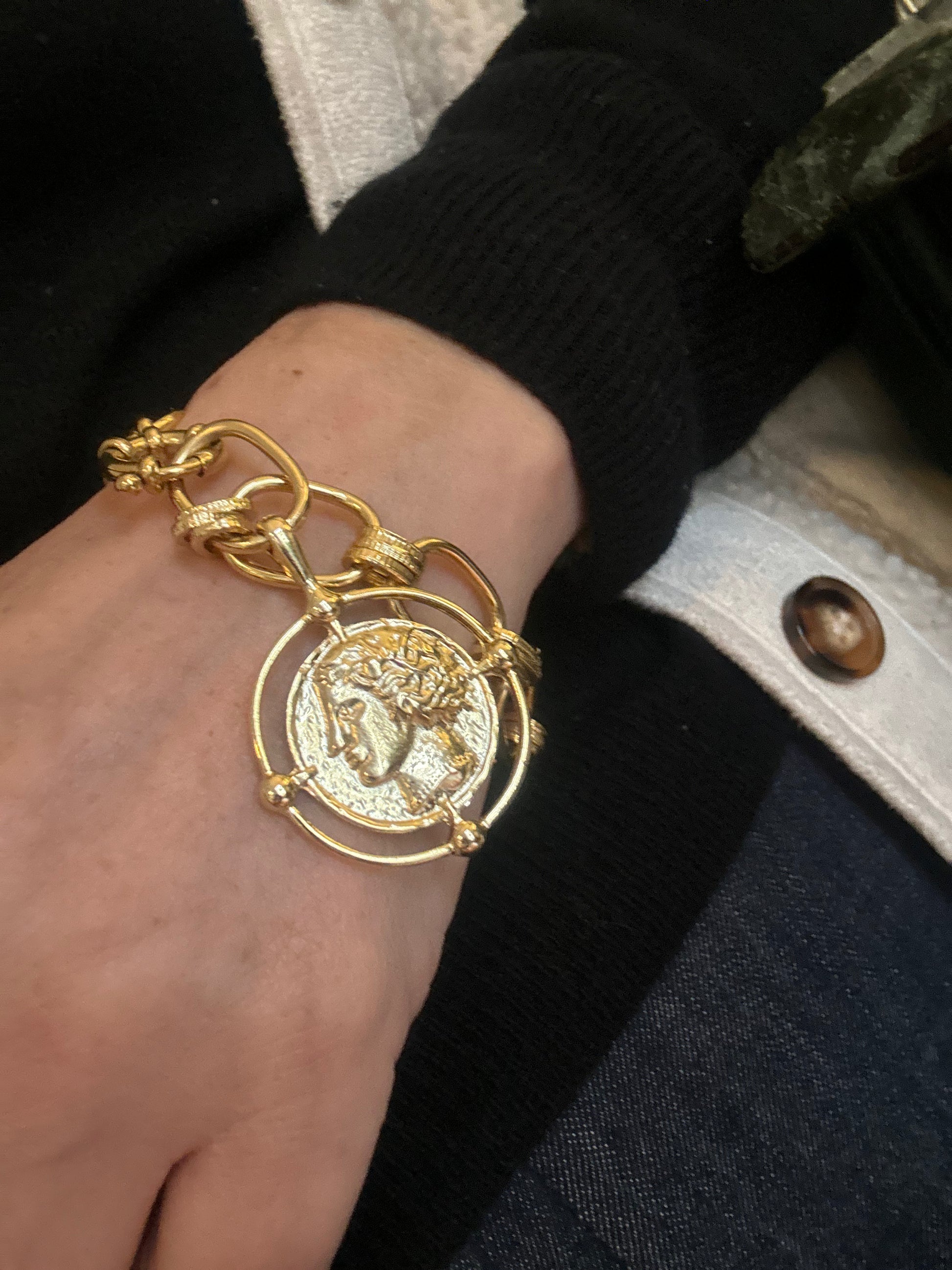 Bracelet grosse maille Simon. il est ornée d'une grosse pièce d'inspiration grecque. Il est ajustable et se règle selon la taille du poignet. Doré à l'or fin 24 carats.